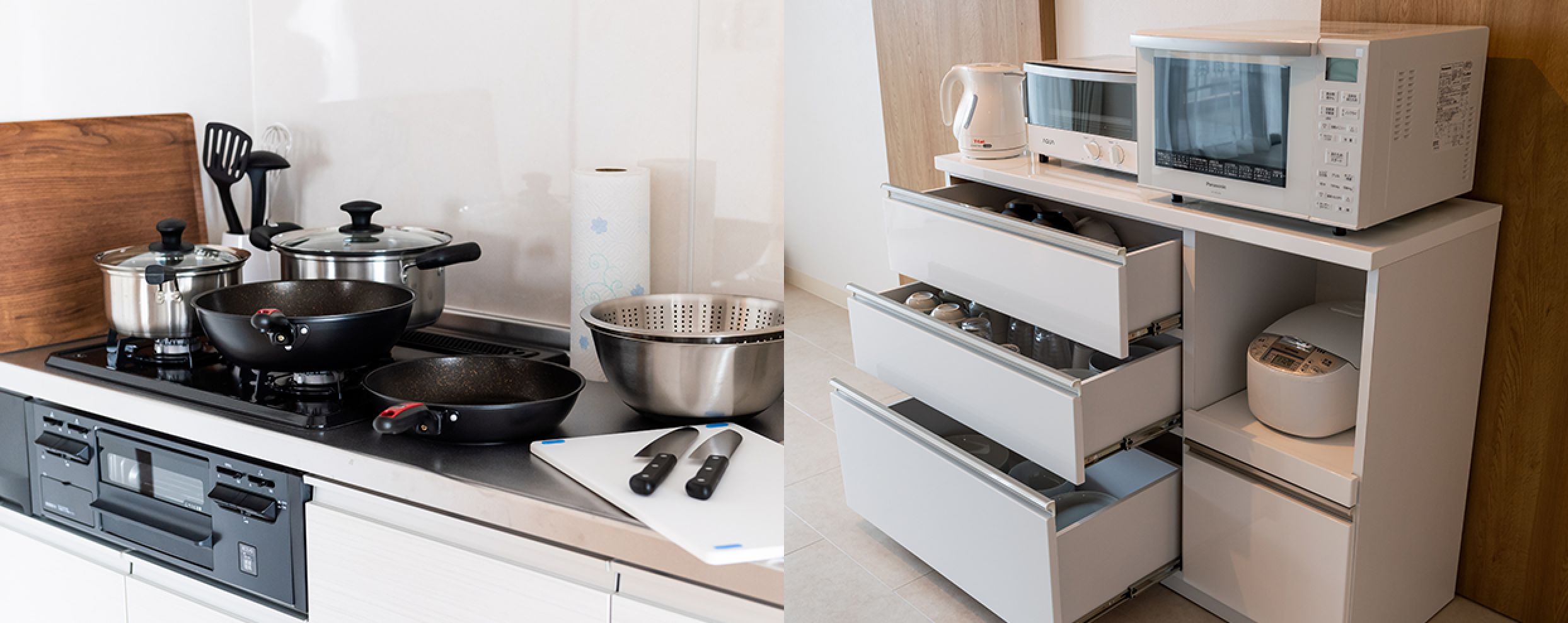 - 基本調理器具(鍋大・小、フライパン深・浅、お玉、フライ返し、ボール、ざる、包丁、まな板)